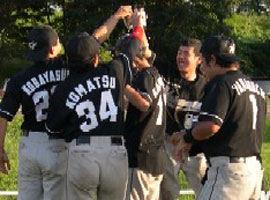 一方打線の方も1回裏2アウトから原田、岩本が出塁、5番倉岡のタイムリーで先制、2回も宇野、小松、羽山のタイムリー、3回は小林、比嘉のタイムリー、4回は原田、岩本のタイムリー、5回は小林のタイムリーと比嘉のホームラン、6回は岩本、倉岡のタイムリーで合計15点。守備でも原田、小林、羽山の内野陣が大活躍、最後は志村が締めて完勝。先発小松はスローピッチ史上初(?)の10勝0敗、勝率10割でシーズンを終了した。