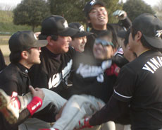 しかし2回以降、開き直ったボルメッツはデータを逆手にあれやこれや変幻自在の攻めを見せた。「さとんシフト」と呼ばれる極端な右寄りシフトの逆を突いたさとん選手の技ありのヒット、あえてシフトの頭上を越えて行く宇野の二打席連続の三塁打、徐々に追いつめられとうとう1点差まで詰め寄られるが、みんなの気持ちは一つだった。